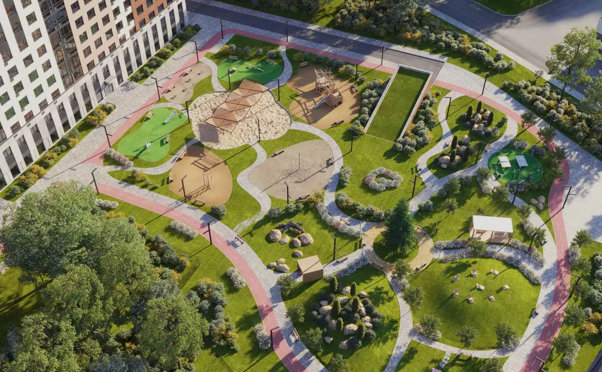 Комплекс находится под охраной и видеонаблюдением. В вестибюлях подъездов предусмотрены кабины консьержей и площадки для размещения сезонного имущества и колясок. Спроектированы подземный паркинг с выходом к лифту. На первых этажах расположены коммерческие помещения.