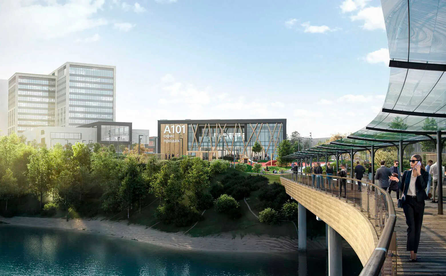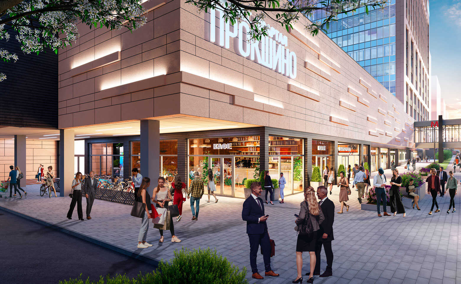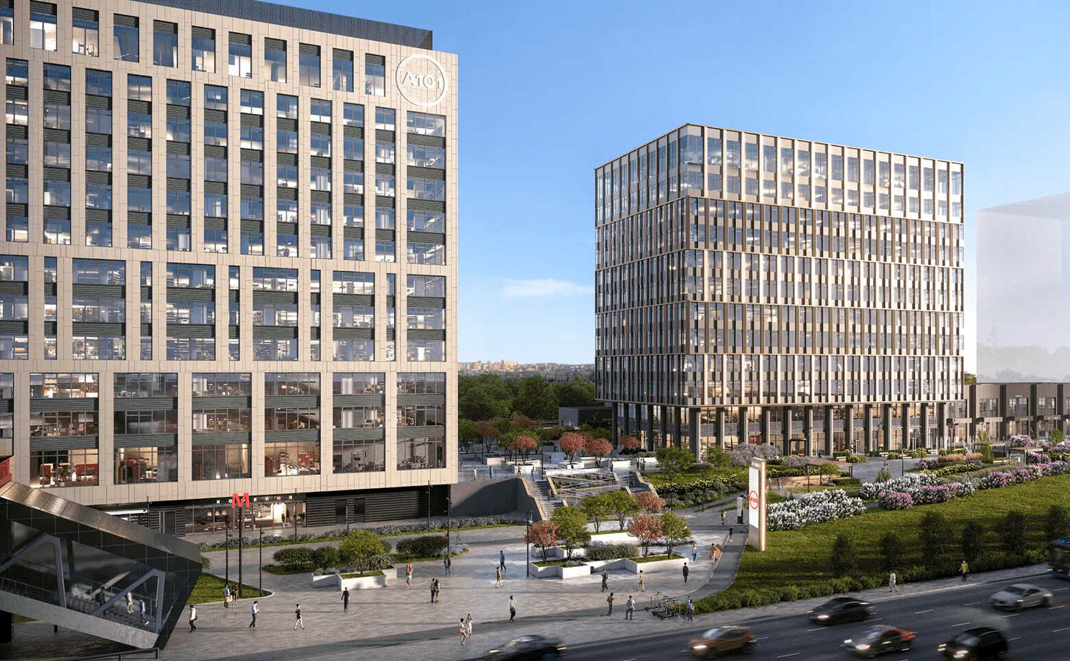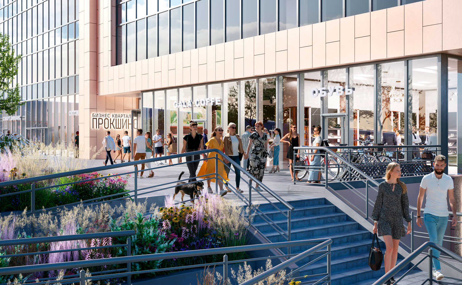 Авторы проекта спланировали пространство между офисными зданиями как частично крытый городской променад с разными точками входа. Здесь размещены кафе и рестораны, дизайнерские мастерские, шоу-румы, хобби-центры. Территория вокруг променада — транспортный хаб с парковками и остановками общественного транспорта.
