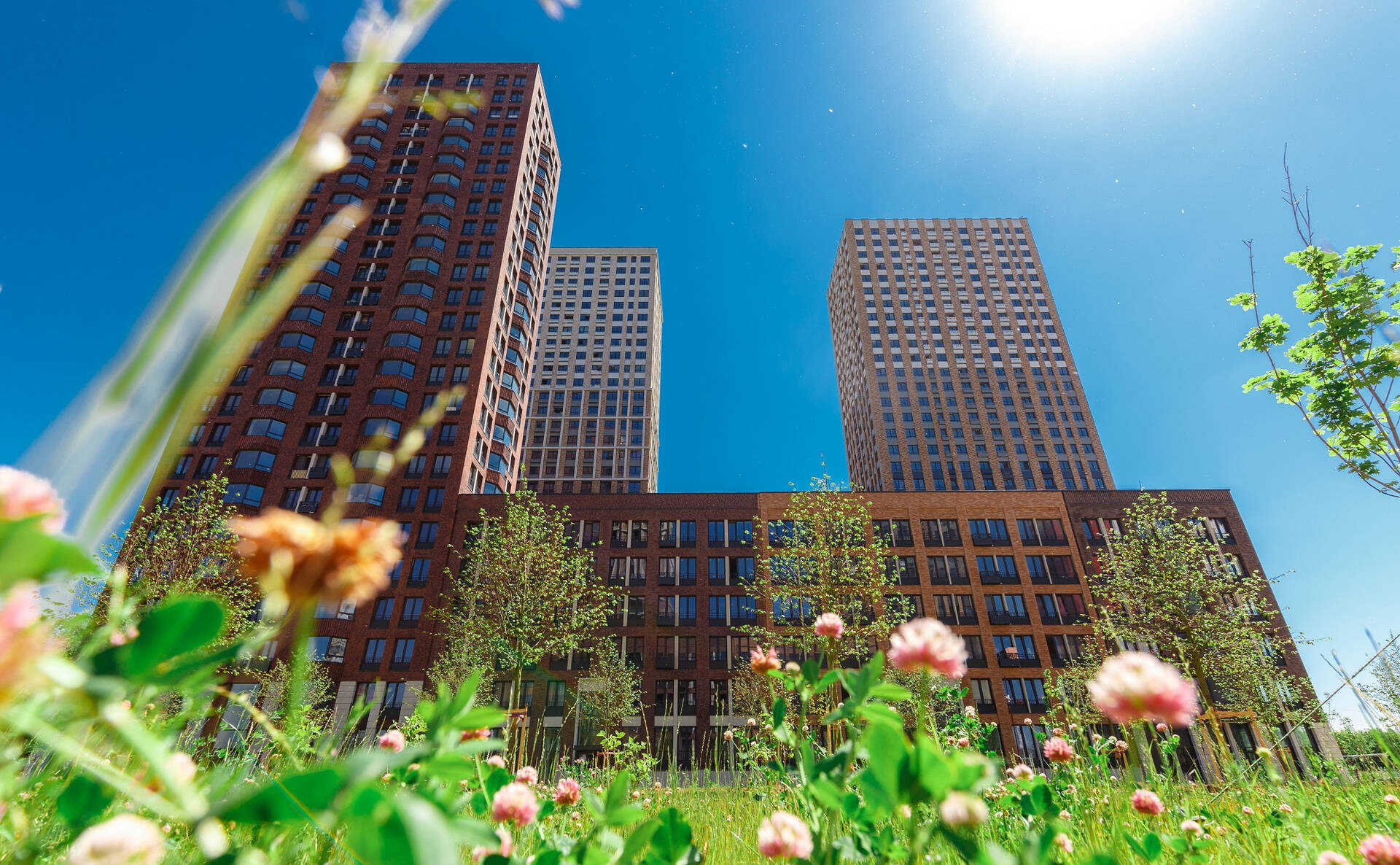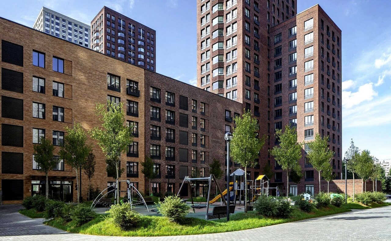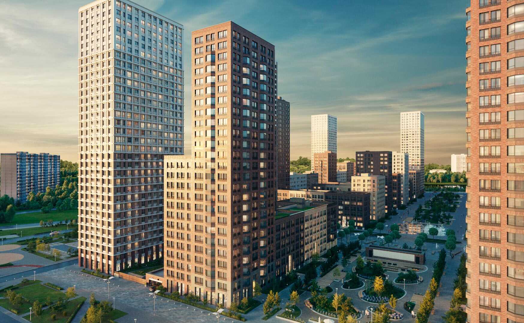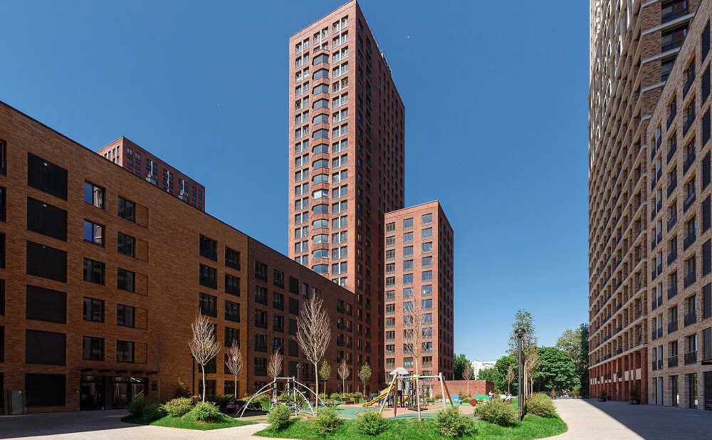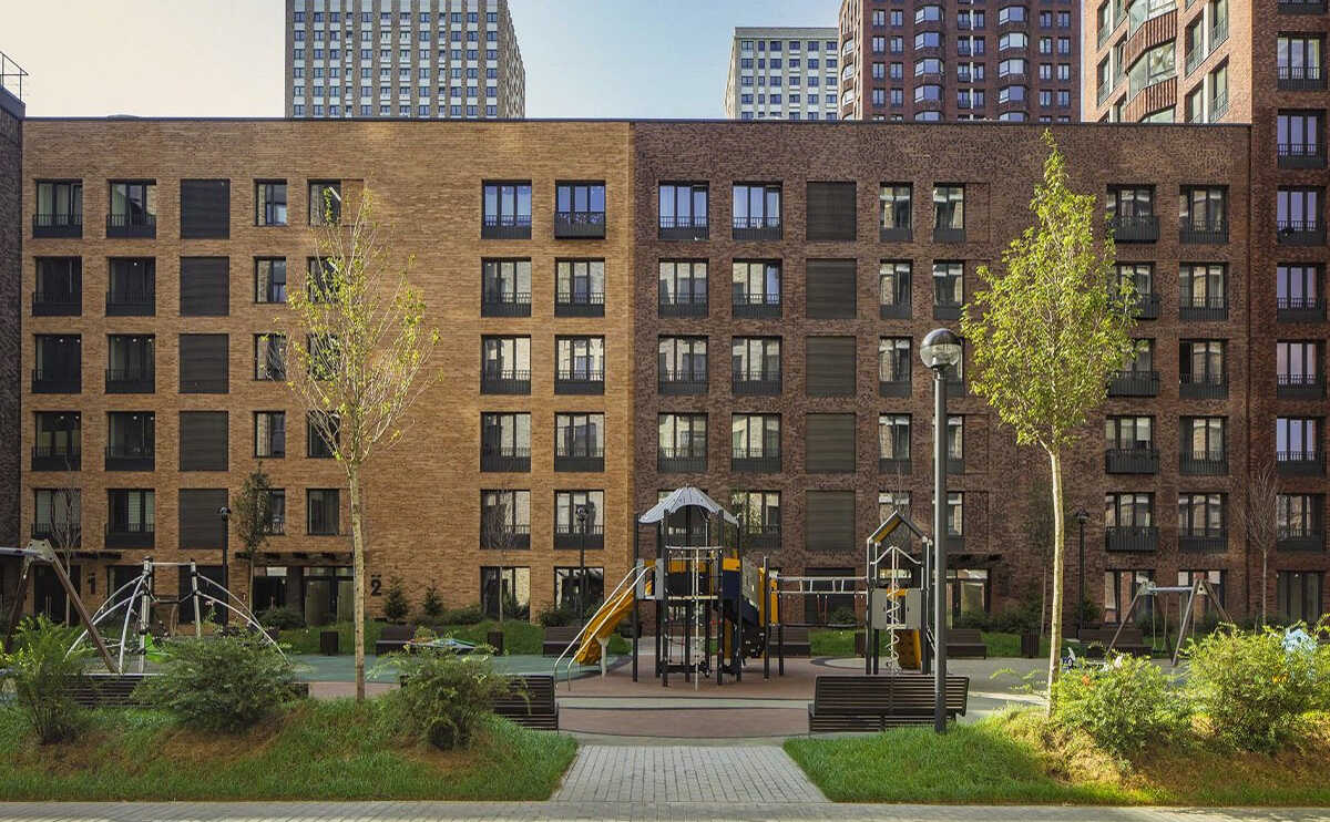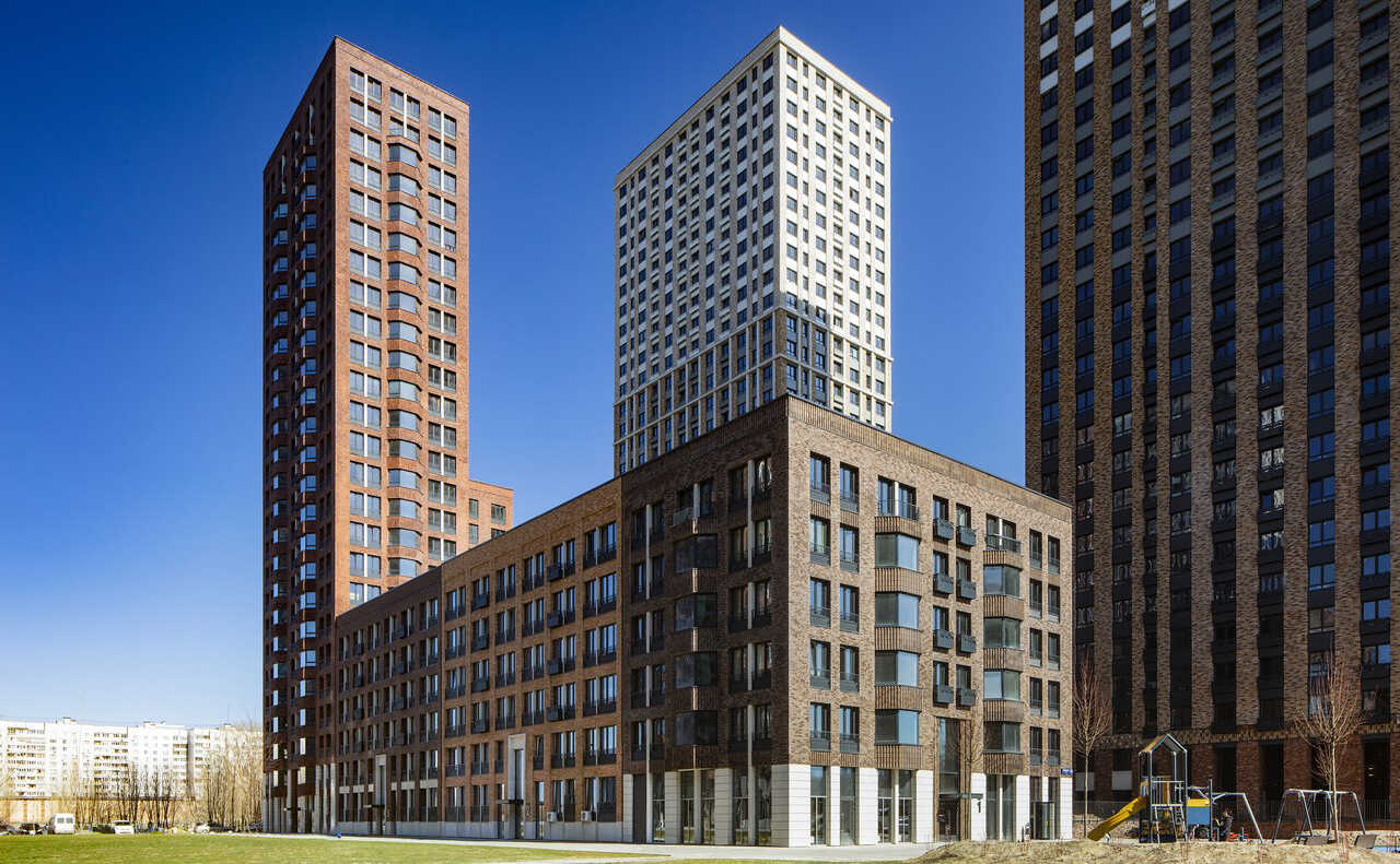 Микрорайон «Домашний» – проект голландского архитектурного бюро «MLA+», который состоит из восьми блоков, реализованных в три очереди. Каждый блок включает в себя малоэтажные дома в 6-9 этажей и башни в 25-32 этажа с закрытым двором. Дома построены по долговечной монолитной технологии с навесными вентилируемыми фасадами из кирпича, выполненными в разных оттенках бежево-коричневых тонов и разными варинтами кладки.