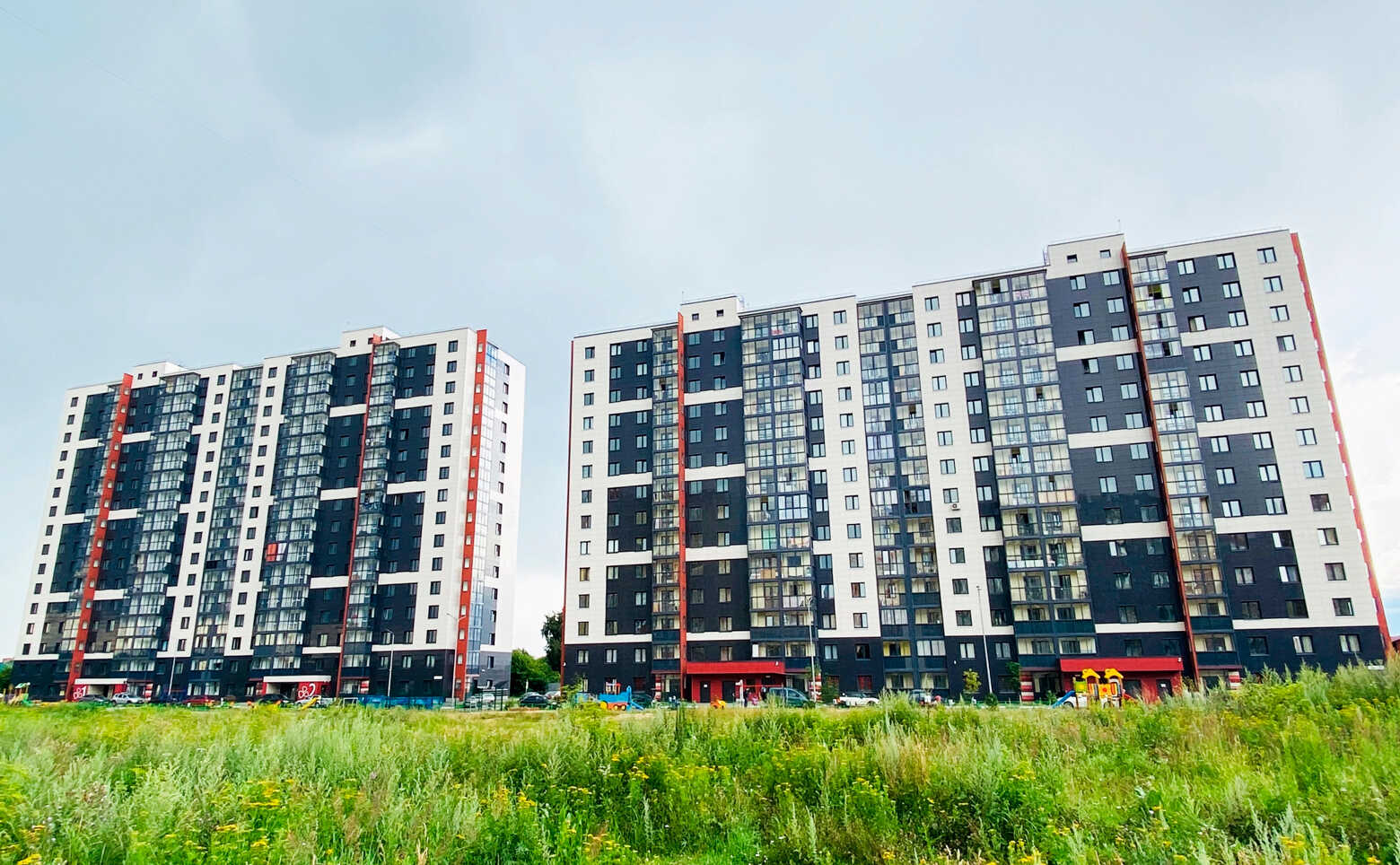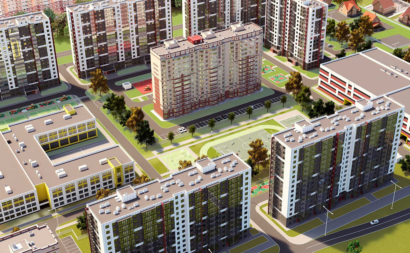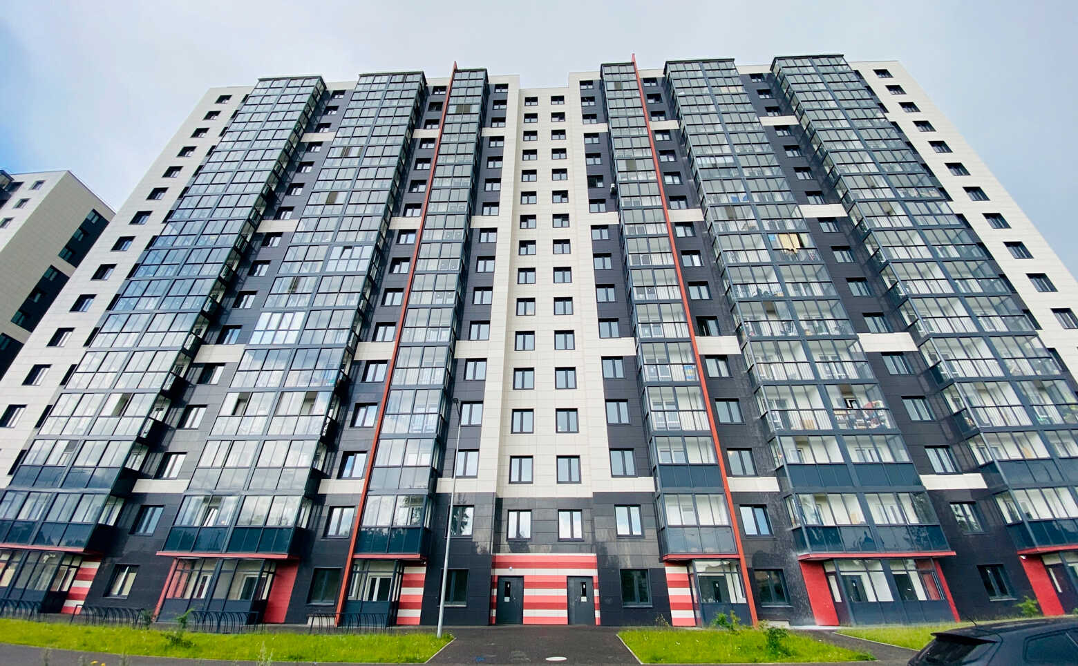 Жилой комплекс «Финский» — это 9 корпусов высотой от 14 до 17 этажей. В оформлении стен зданий используется навесной вентилируемый фасад с яркими цветными вставками. Во всех домах выполнена дизайнерская отделка входных групп и установлены современные лифты.