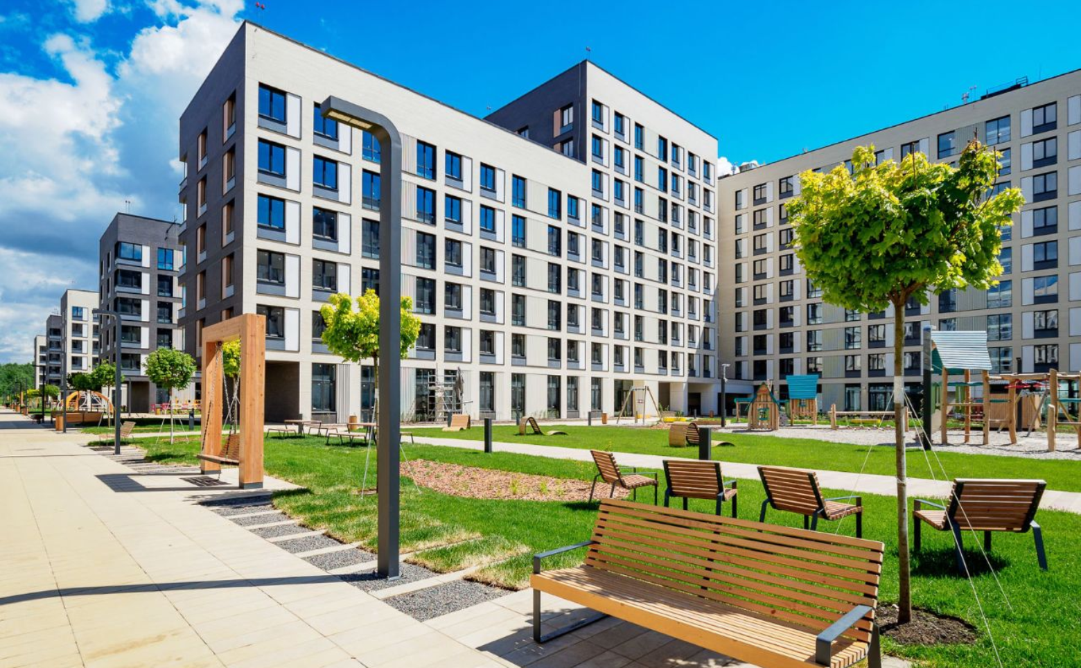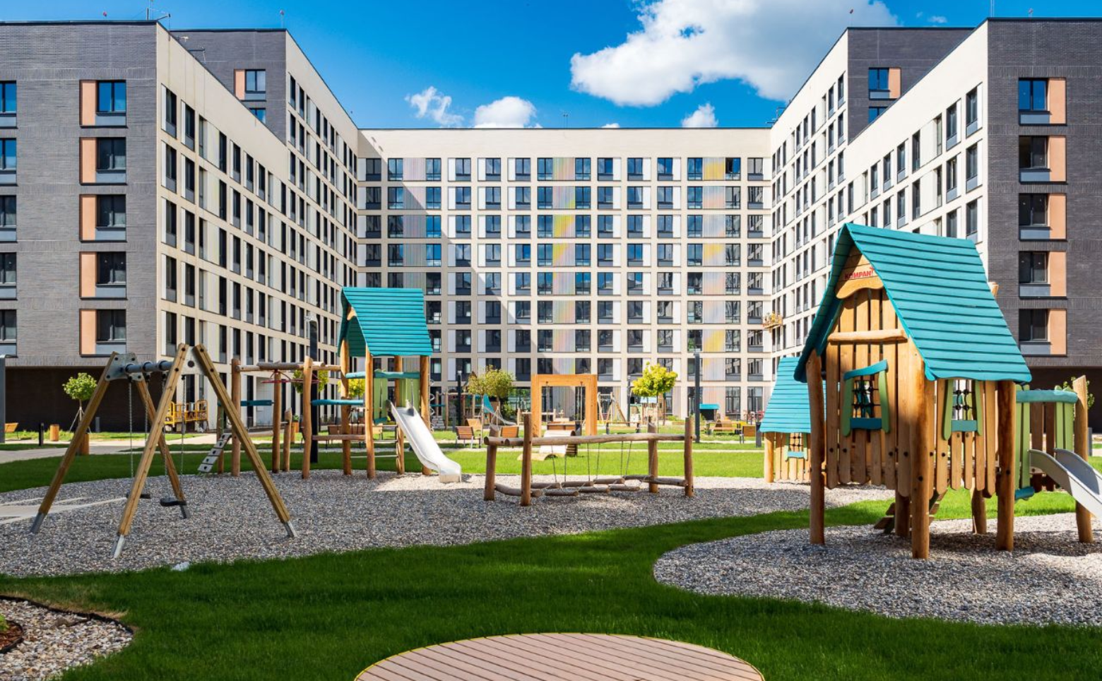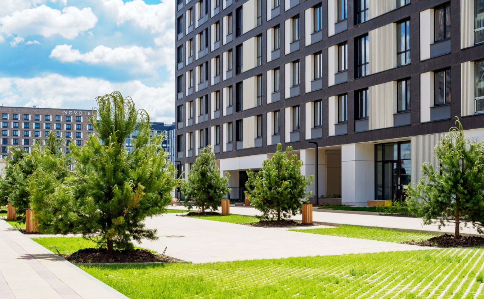 Территория по периметру огорожена, предусмотрена служба охраны и видеонаблюдение. Придомовая территория комплекса благоустроена и включает в себя пешеходные дорожки, арт-объекты, места для отдыха, детские и спортивные площадки. Концепция благоустройства разработана голландским бюро MLA+. На территории ЖК предусмотрены школа и детский сад. В стилобатной части спроектирован подземный паркинг на 800 мест.