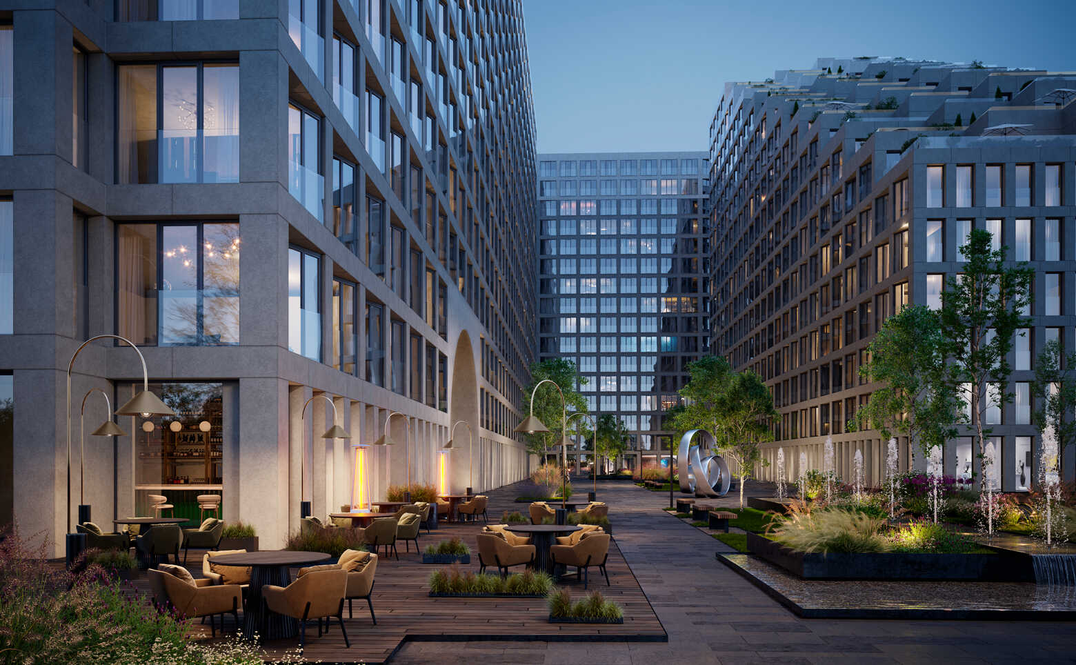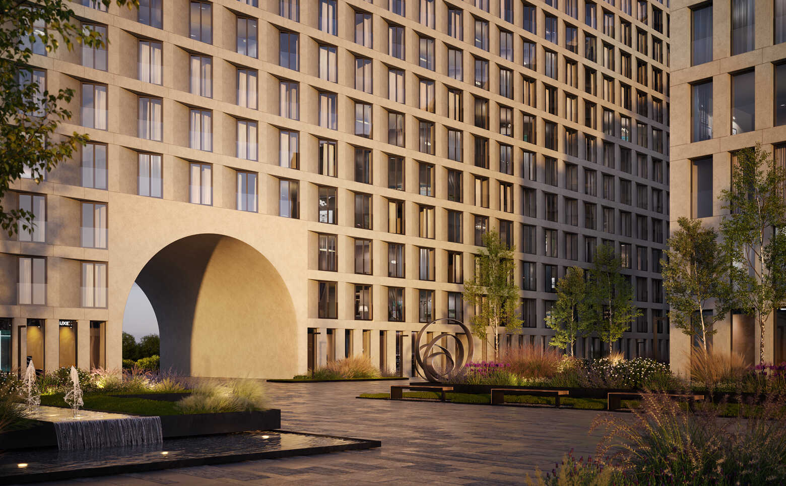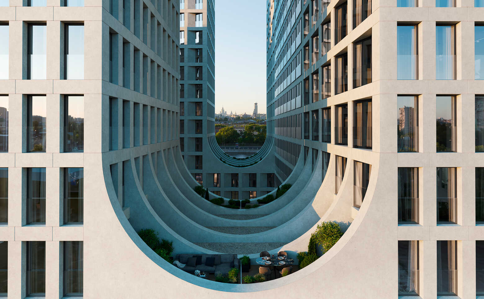 Комплекс апартаментов состоит из 3 корпусов переменной этажности высотой от 10 до 16 этажей. Проект создан в бюро «Цимайло, Ляшенко и партнеры». Выполнен он в стиле современного минимализма — ступенчатый силуэт террас задает ритм, а матовый архитектурный бетон в облицовке сглаживает масштаб здания. Цвет фасада — слоновая кость. В дизайнерском гранд-лобби с водопадом обустроена зона ожидания с мягкой мебелью и журнальными столиками. Рядом расположены Lounge Bar с пекарней и Speakeasy Bar. В проекте предусмотрен консьерж-сервис.