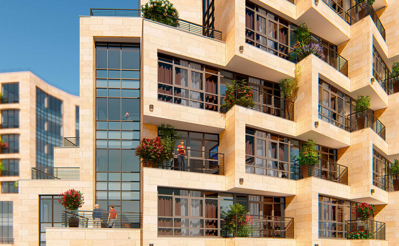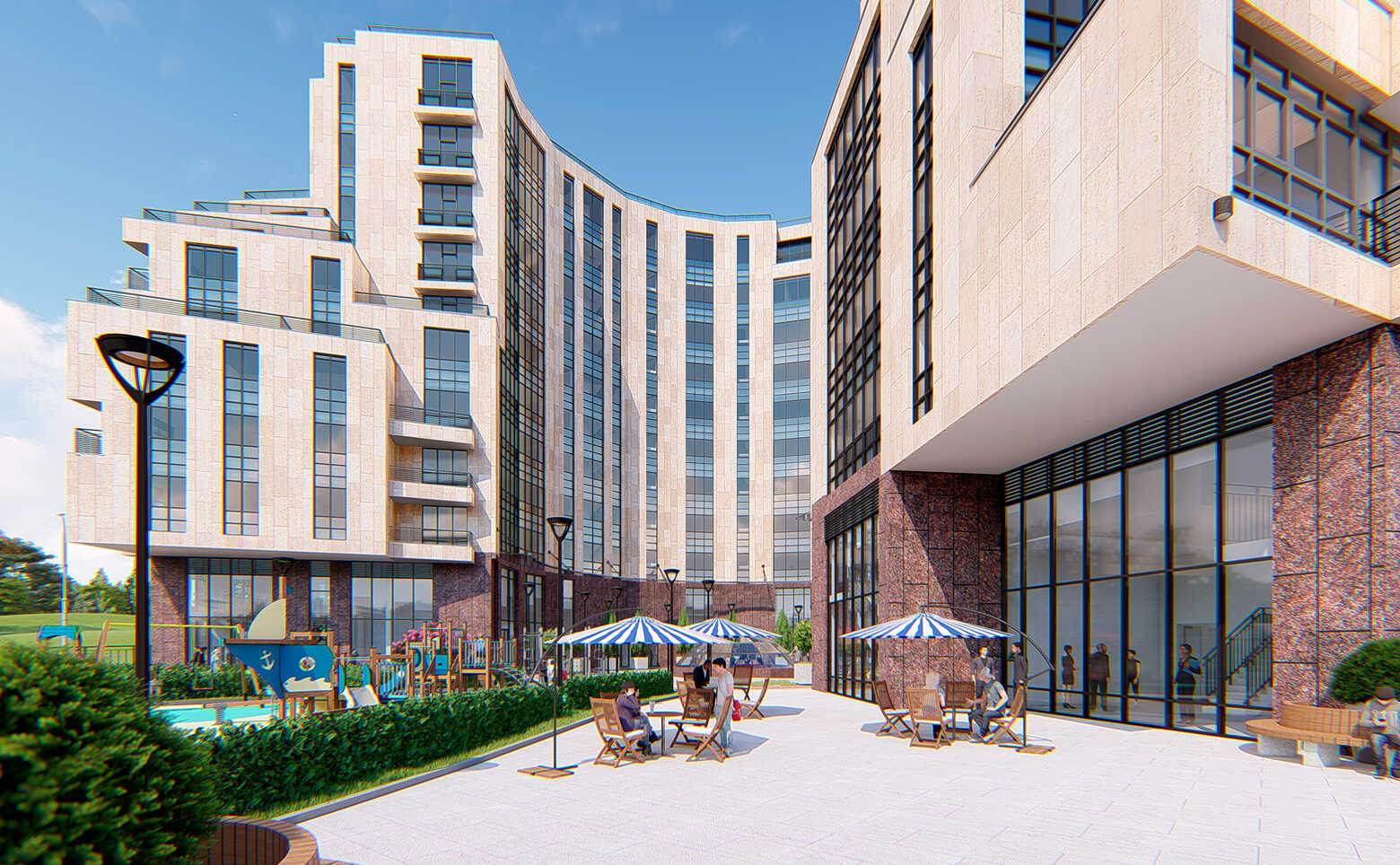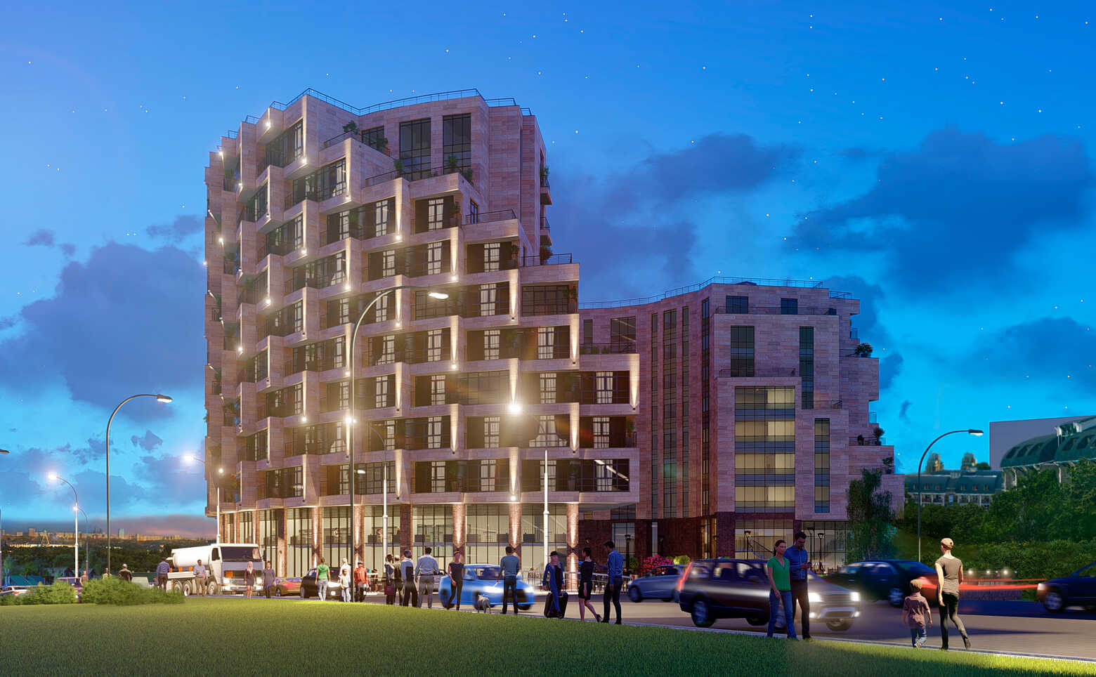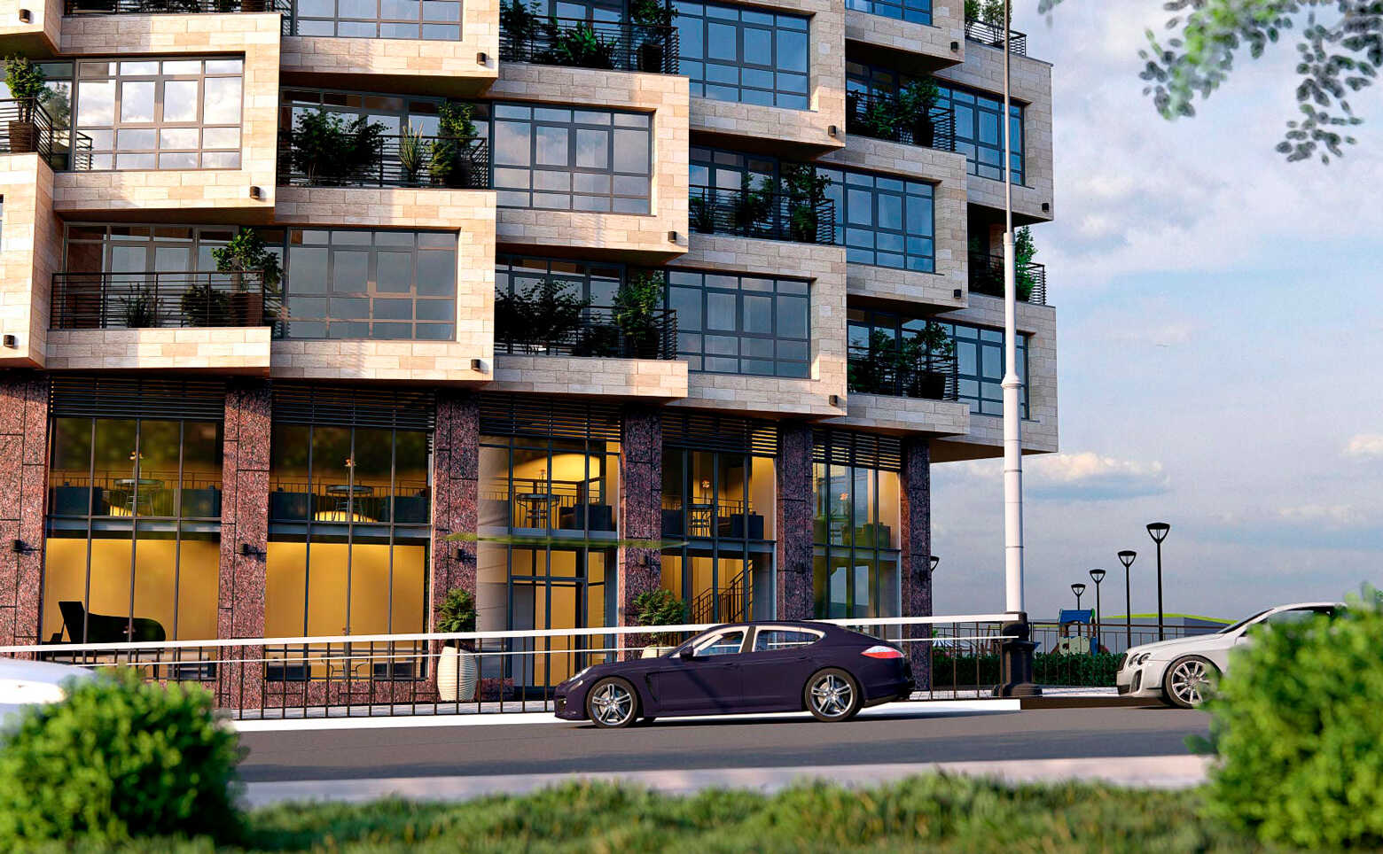 Здание клубного дома выполнено в виде цилиндра с атриумом в верхней части цоколя. Стильный и современный фасад сформирован выступающими угловыми террасами. Современная ступенчатая архитектура со смещением этажей относительно друг друга и лобби высотой 7 метров создают запоминающийся и яркий образ. Для отделки фасада используется натуральный камень: иранский гранит и светлый травертин.