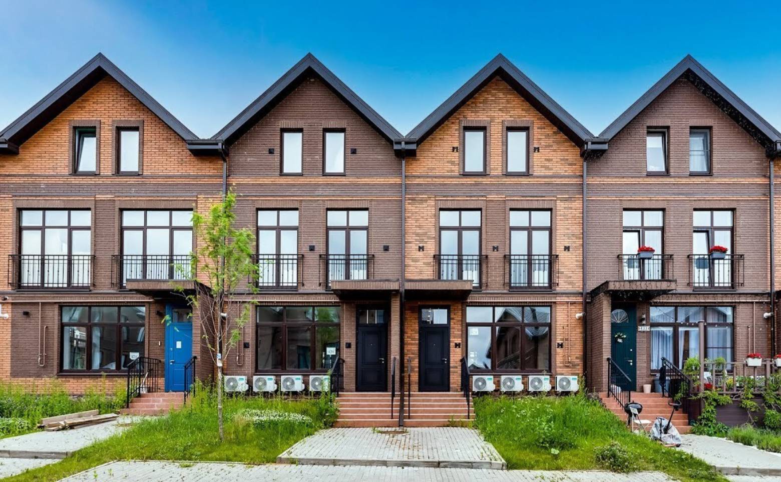 В проекте представлены таунхаусы и квадрохаусы с мансардами от 96 кв.м. до 162 кв.м. Окна второго этажа и мансарды — французские балконы в пол. Проведены все центральные коммуникации: газ, вода, канализация, электричество.