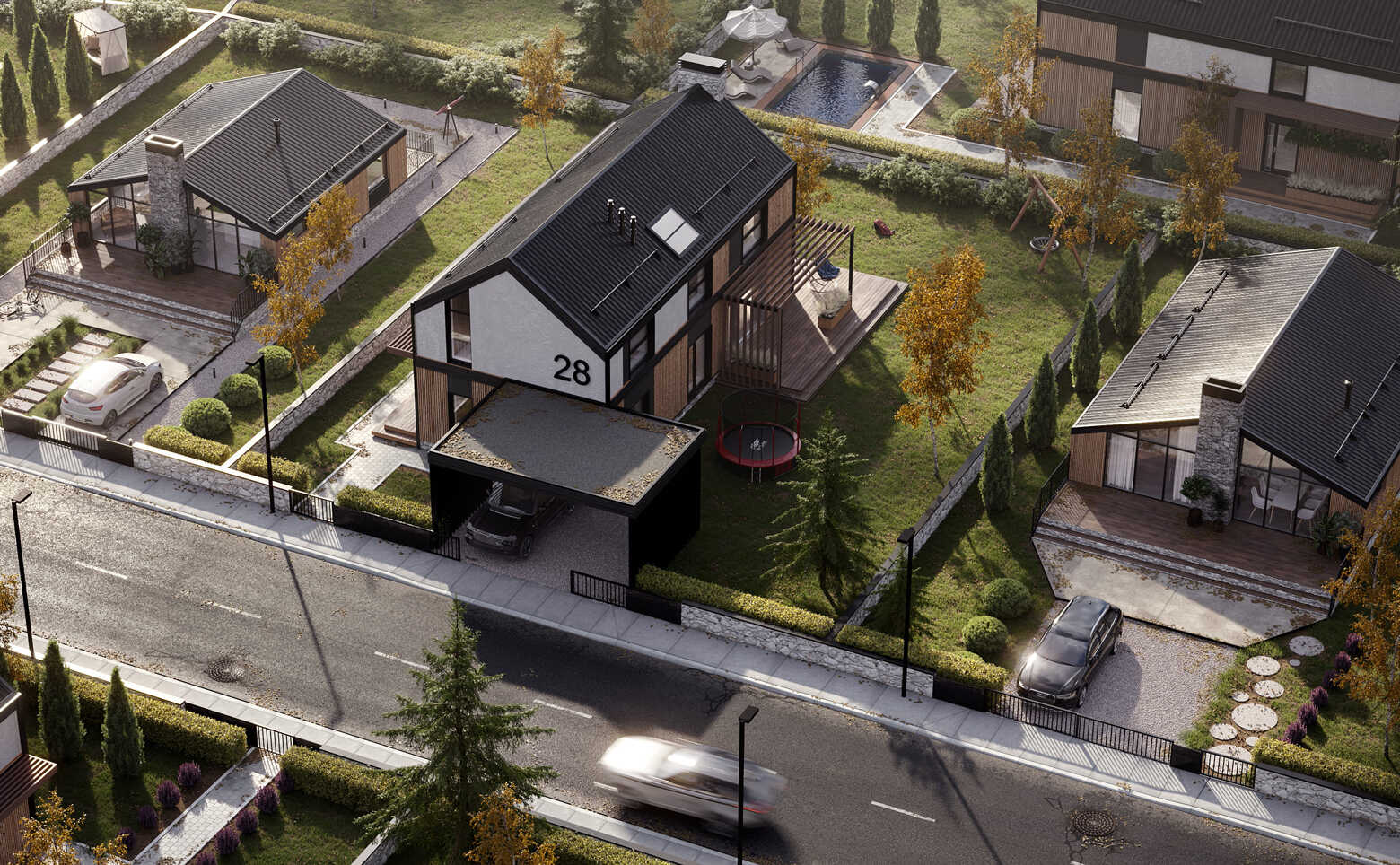 Клубный загородный квартал состоит из 27 участков площадью от 6 до 9 соток. Земля предназначена под индивидуальное жилищное строительство, есть возможность заказать строительство каркасного дома по проекту застройщика. К участкам подведены городские коммуникации: электричество, водоснабжение, канализация, газ. Территория огорожена и благоустроена.