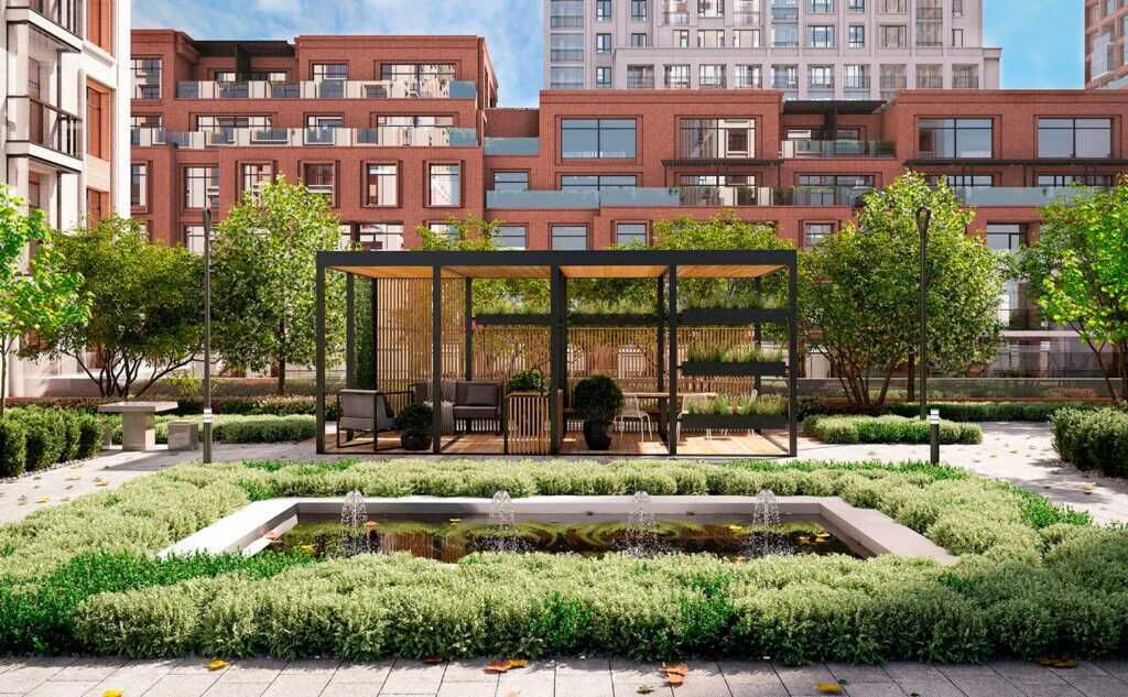 Пространство дворов спроектировано в стиле пэчворк, с каменными садами. взрослыми деревьями и кустарниками. Современные детские площадки, размещённые на территории комплекса, были разработаны совместно с психологами. Для жителей первой очереди на крыше торгово-развлекательного центра спроектирован приватный двор-сад с коворкингом, детской зоной, песочницей и местом для отдыха с лежаками.