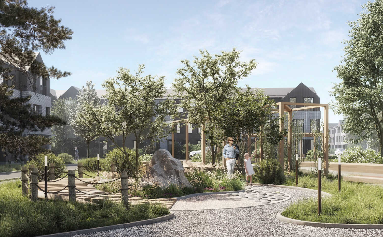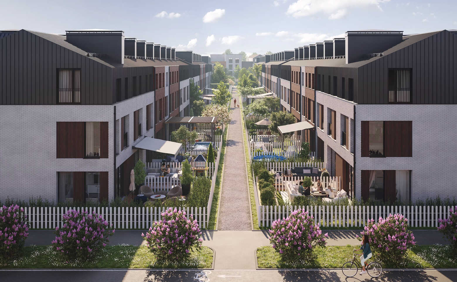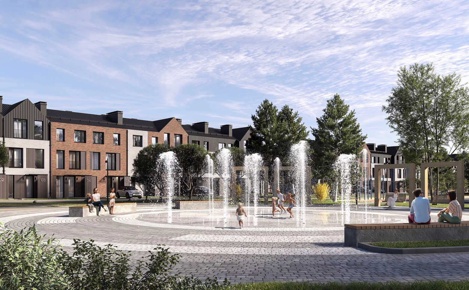 Проект представляет собой современный малоэтажный клубный поселок таунхаусов. Трехэтажные кирпичные здания состоят из 6 – 10 секций. Фасады выполнены в скандинавском стиле. В их отделке использовано сочетание кирпича, деревянных ламелей и фальца. Натуральные цвета фасадов гармонично сочетаются с природным окружением.
