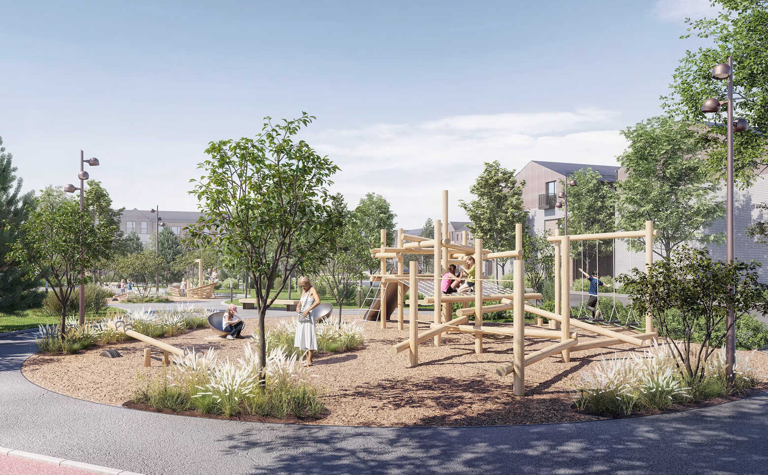В поселке выполнен ландшафтный дизайн территории с сухим фонтаном без чаши и тактильным лабиринтом. В сердце поселка расположен живописный пруд с собственным пляжем и катком в зимний период, а всю территорию поселка опоясывает утопающий в зелени прогулочный бульвар протяженностью 1,8 километра. Для любителей спорта предусмотрены зоны воркаута и спортивные площадки под открытым небом, проложены велосипедные и беговые маршруты. Собственная инфраструктура поселка включает в себя торговую галерею и соседский центр с коворкингом, тренажерным залом и детской комнатой. В поселке есть собственный детский сад нового формата на 170 мест и школа с мультимедийными и IT-классами на 350 учеников.