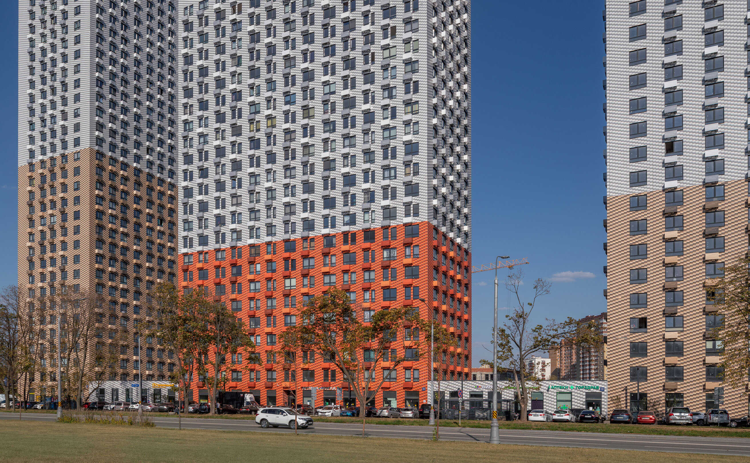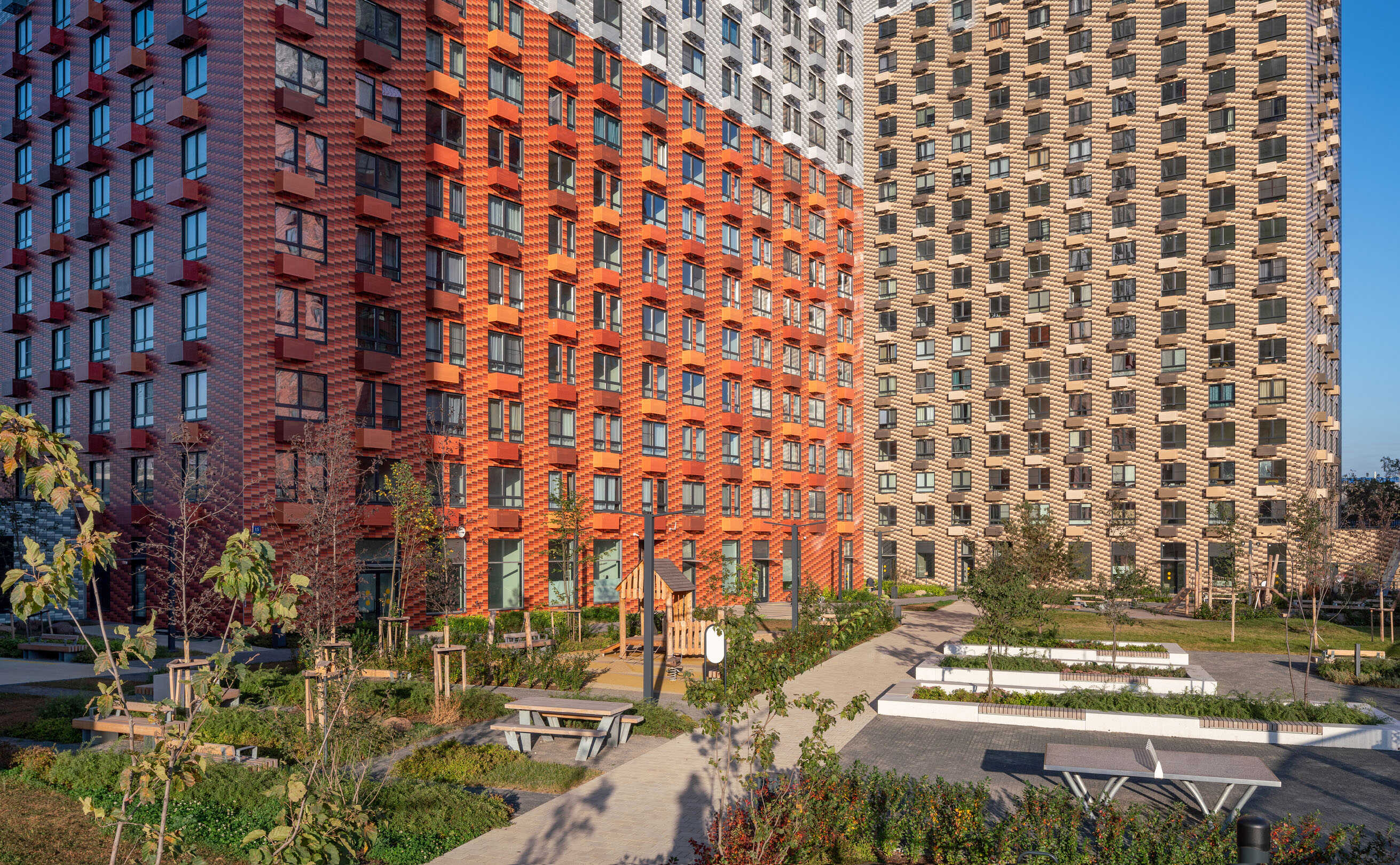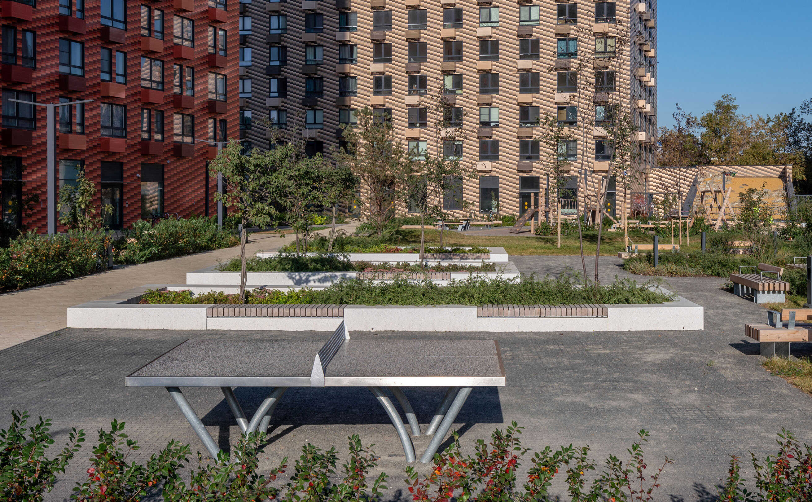 На первых этажах расположены коммерческие помещения. В закрытом от проезда машин дворе имеются детские и спортивные площадки, а также места для отдыха. Для автовладельцев спроектирован подземный паркинг на 251 место.