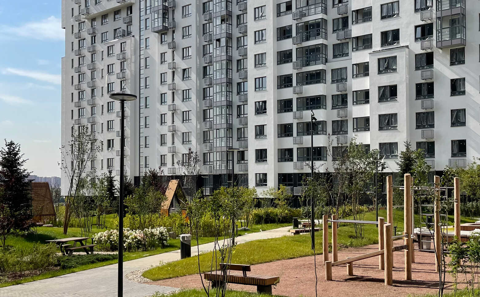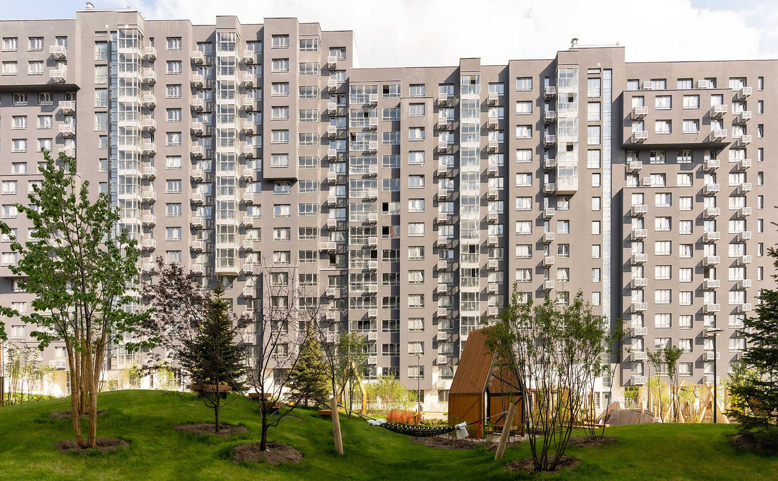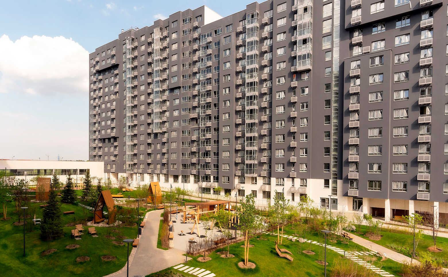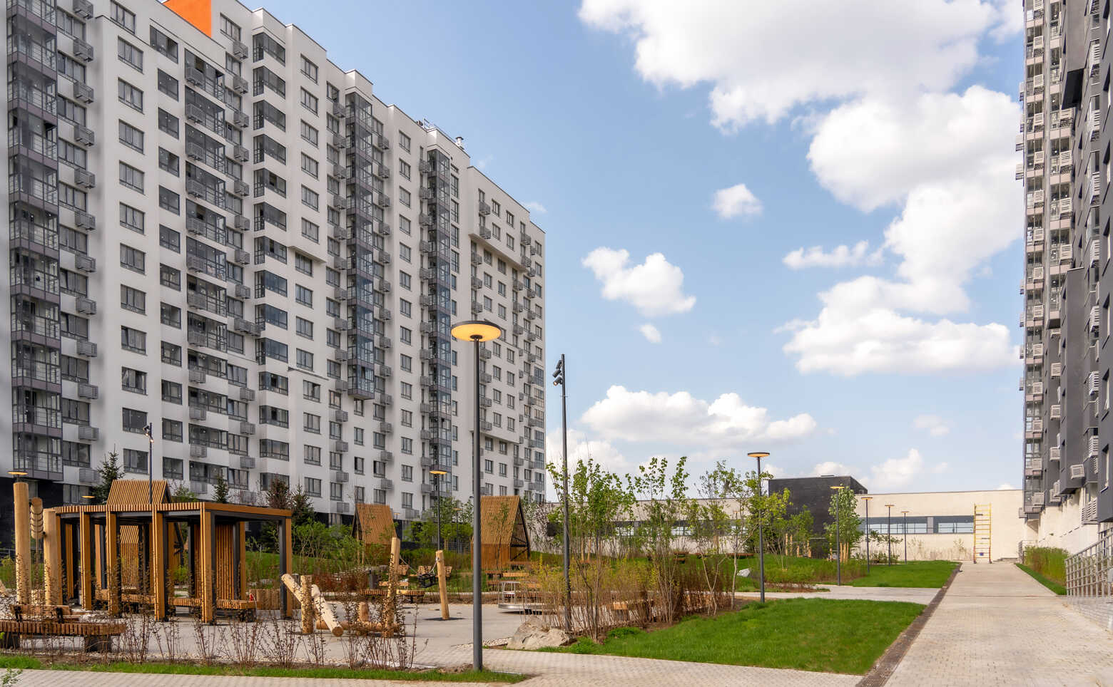 Дворы корпусов — это приватное пространство с современными детскими и спортивными площадками, местами для прогулок и отдыха. На территории комплекса возведен учебно-воспитательный комплекс на 1700 мест: в него входит школа на 1350 учеников и детский сад на 350 малышей. Для владельцев автомобилей предусмотрен совместный одноуровневый паркинг на -1 этаже на 957 машино-мест с доступом на лифте с любого этажа.