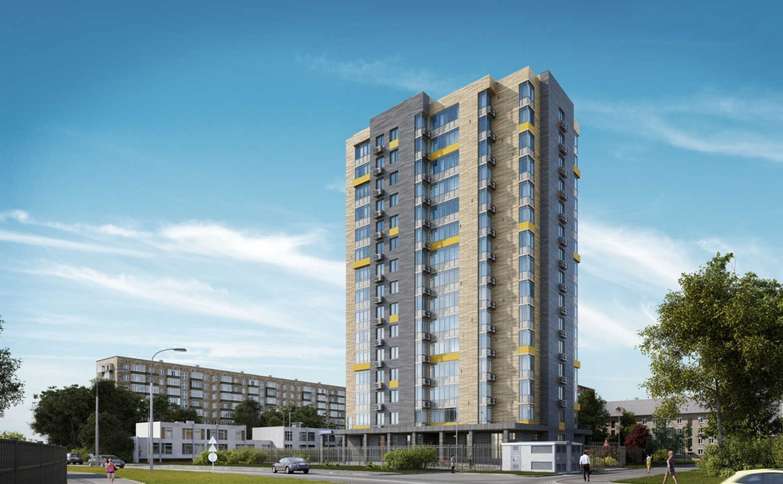 Жилой комплекс «Лидер на Дмитровском» представляет собой монолитное здание высотой в 15 этажей. Дизайн-проект дома предусматривает облицовку вентилируемых фасадов искусственным камнем. Наружные стены украшены яркими цветными акцентами.