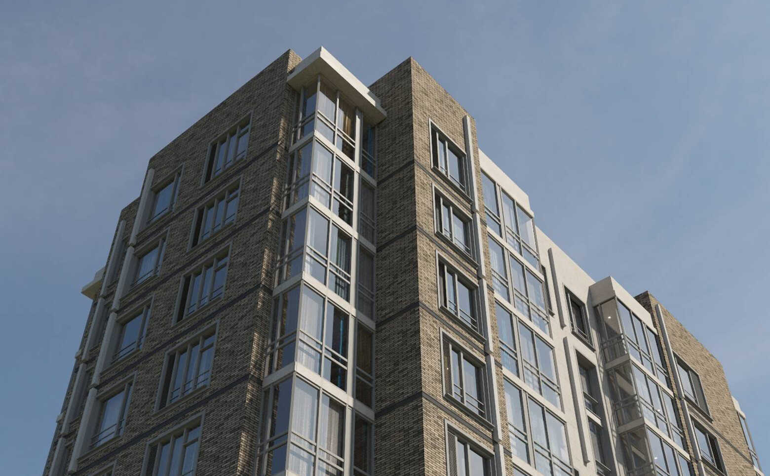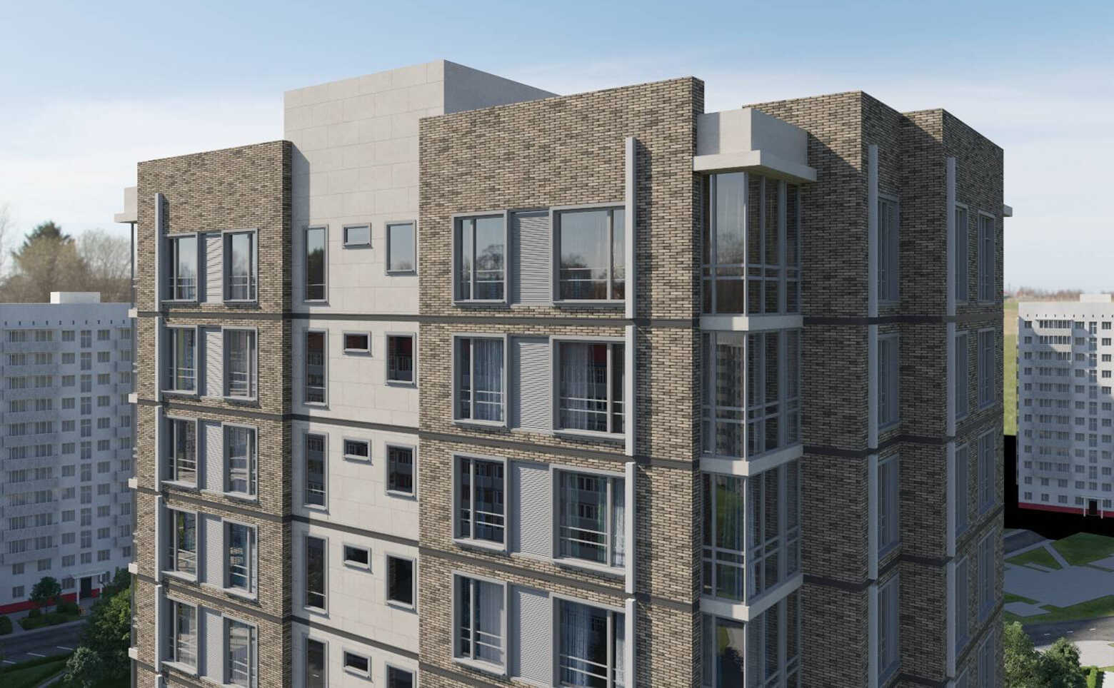 Особенностью наружных стен являются угловые вертикали с остекленными балконами по всей высоте здания.