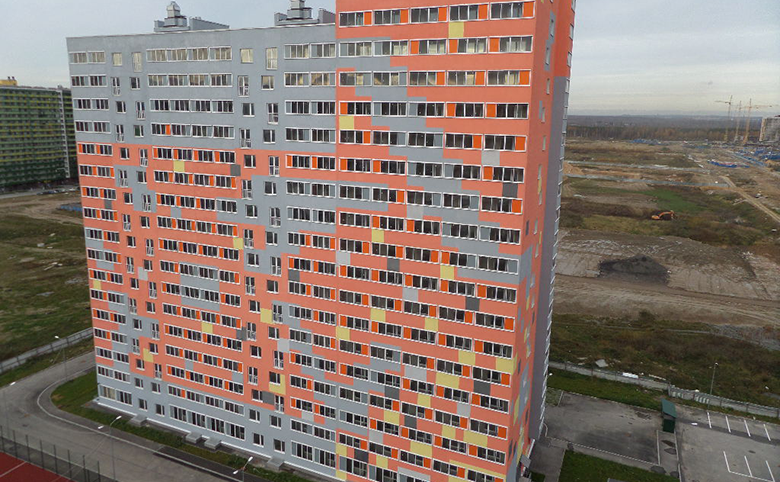 Жилой комплекс «Северная палитра» – многоэтажная застройка возле метро «Девяткино». В проекте квартала 6 корпусов. На лестничной площадке до 6 квартир. Для строительство выбрана кирпично-монолитная технология. Фасадные стены утеплены минераловатой и декорированы насыщенными сине-желтыми цветами по штукатурке.