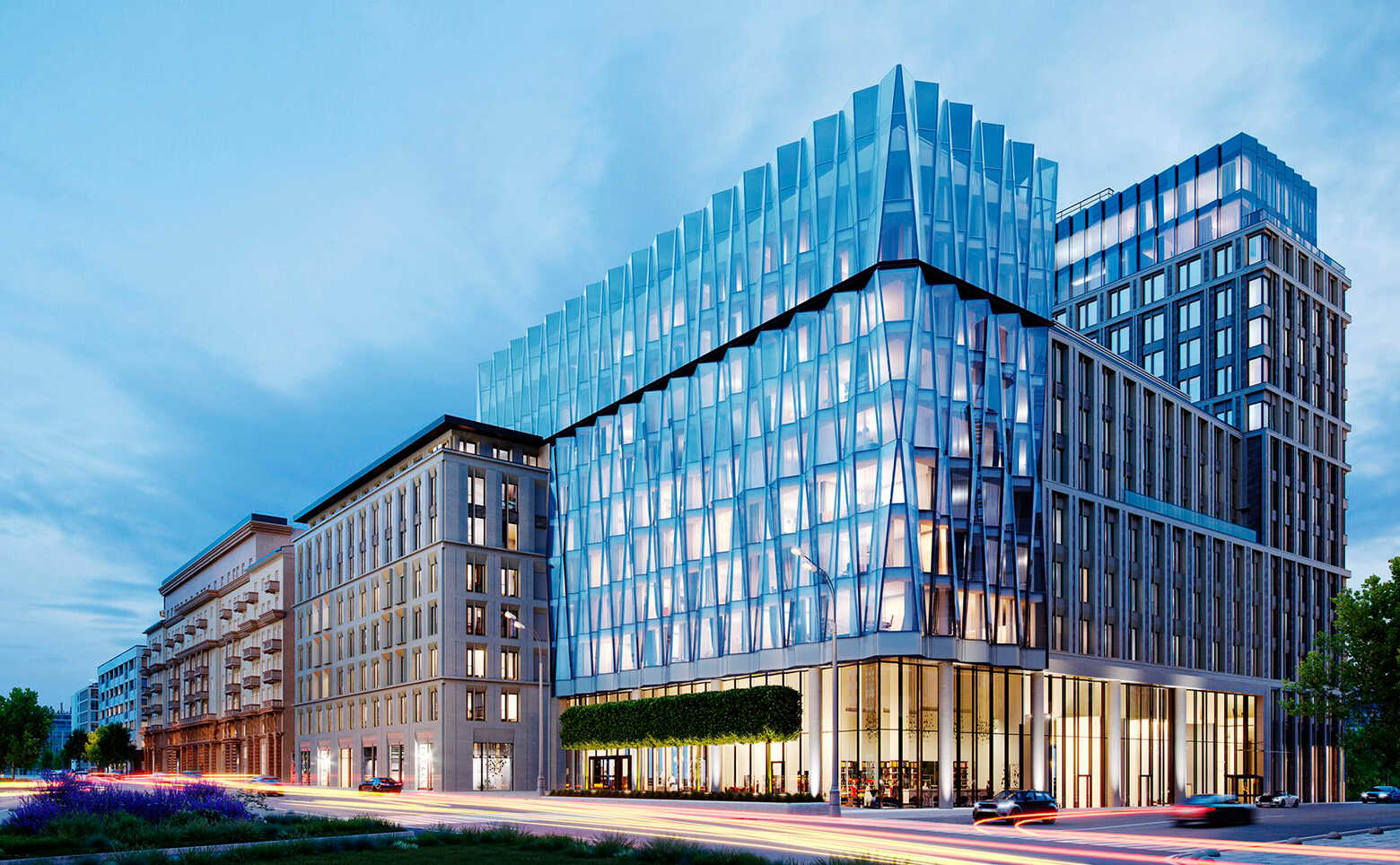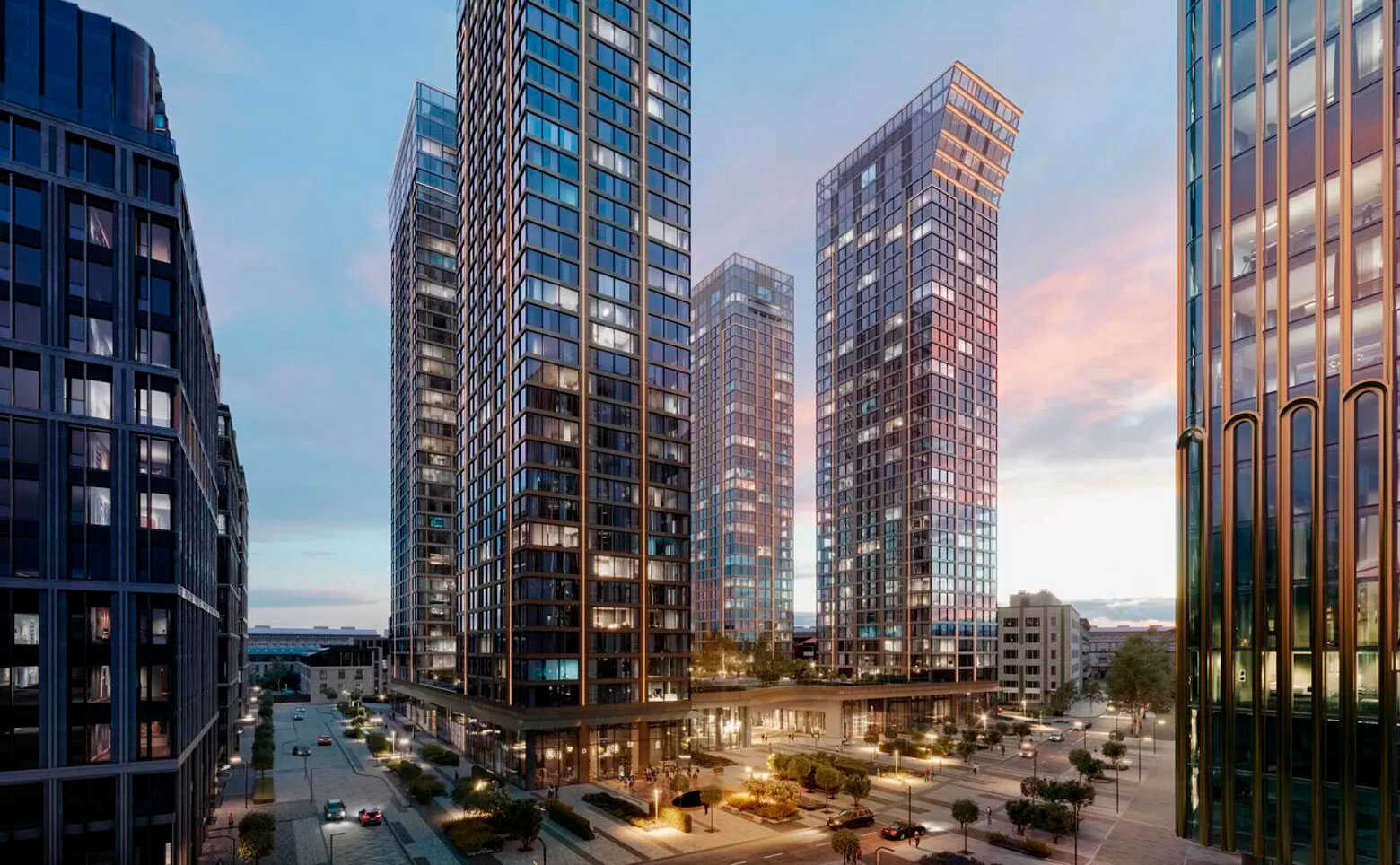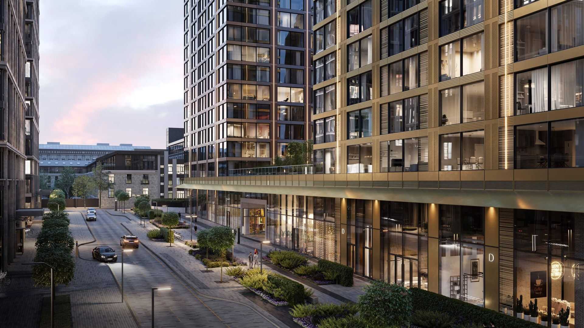 На первых этажах 3 корпусов расположены лаунж-зоны, детский сад, фитнес-центр, кафе и рестораны, супермаркеты, консьерж сервис и другая необходимая инфраструктура. Благоустройство дворов выполнено международным бюро Gillespies и включает в себя: двор-сад, оранжерею под открытым небом, водную композицию, центральный променад, террасу для отдыха, детские игровые и спортивные площадки, деревянные беседки и парковые скамейки, а так же озелененные сады. На закрытой придомовой территории выполнен ландшафтный дизайн, организованы места для отдыха и спроектирована площадь с фонтаном. Для владельцев автомобилей предусмотрен подземный паркинг оборудованный системами подкачки шин и зарядкой для электромобилей.