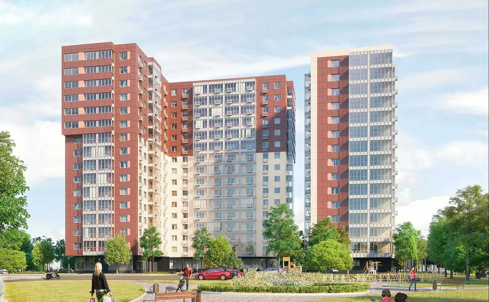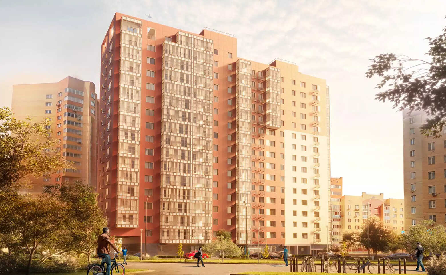 Жилой комплекс «Солнечный» включает в себя кирпично-монолитные корпуса переменной этажности. Вентилируемые фасады из керамогранита выполнены в светло-оранжевых оттенках.