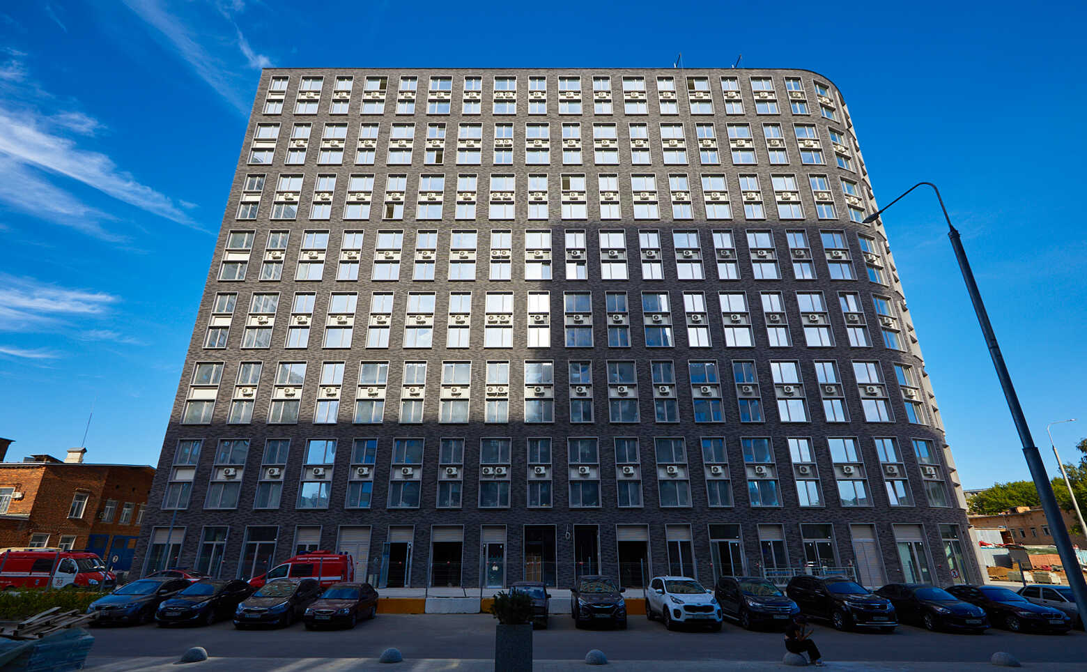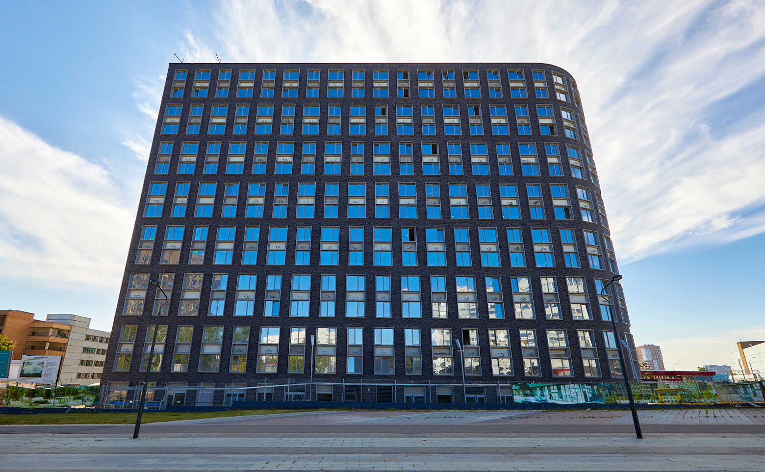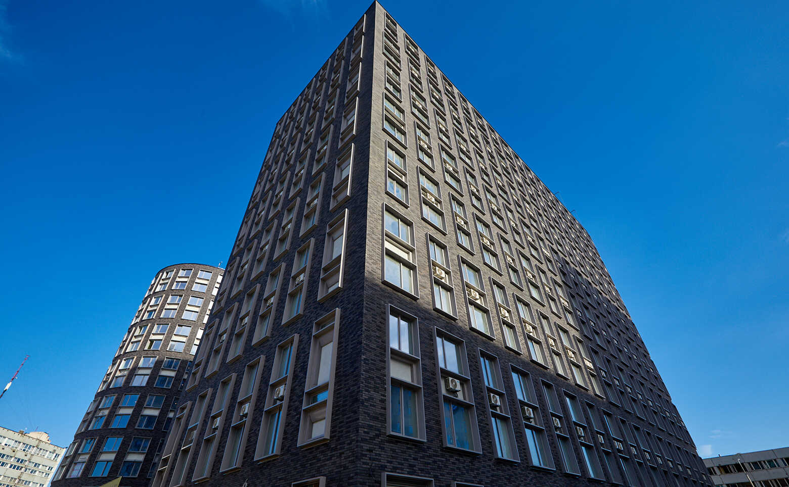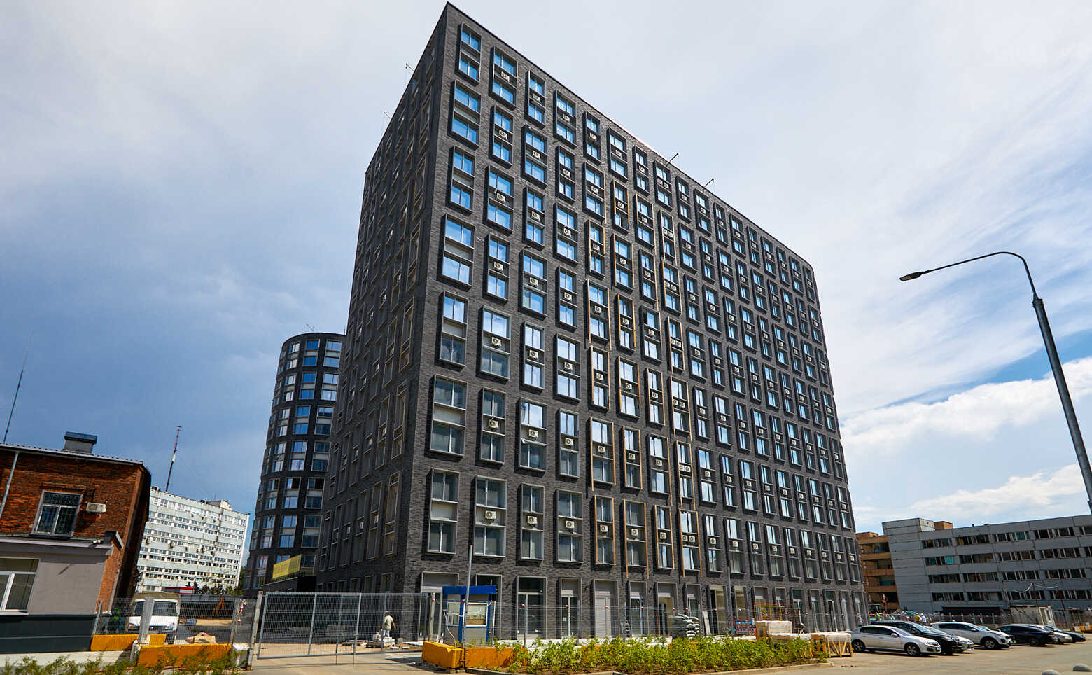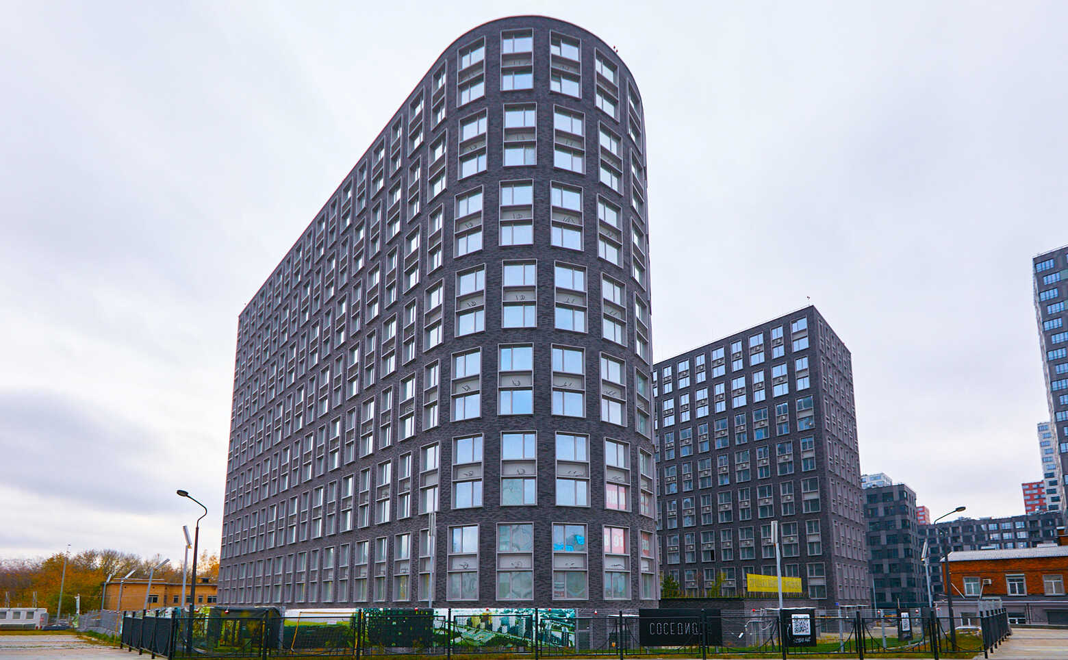 Проект включает в себя 3 корпуса, соединенных небольшими мостами. На крыше центрального нежилого корпуса обустроен собственный сквер. Навесные вентилируемые фасады зданий облицованы темным искусственным кирпичом. В лобби, располагающимся на уровне земли, выполнена дизайнерская отделка.