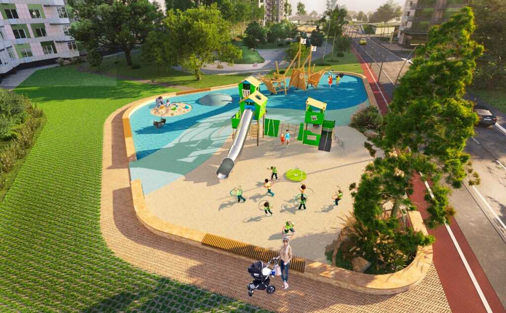 На территории комплекса создано обилие зон отдыха с цветами и кустарниками, установлены яркие и безопасные детские, игровые и спортивные площадки с турниками и специализированным оборудованием. Оригинальным обрамлением комплекса является ландшафтный дизайн с архитектурными фигурами в полный рост. В комплексе есть собственный стадион с трибунами, беговыми дорожками, футбольным полем и хоккейной коробкой.