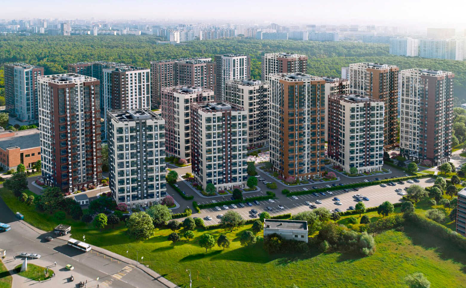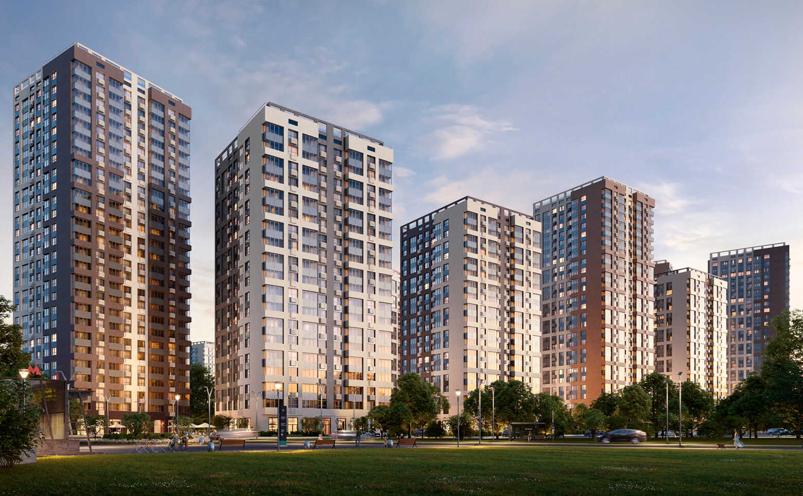 Проект представляет собой 11 корпусов переменной этажности до 26 этажей. Вентилируемый фасад зданий создает благоприятные условия для непрерывной циркуляции воздуха и комфортный температурный режим. На фасаде предусмотрены специальные места для размещения кондиционеров.