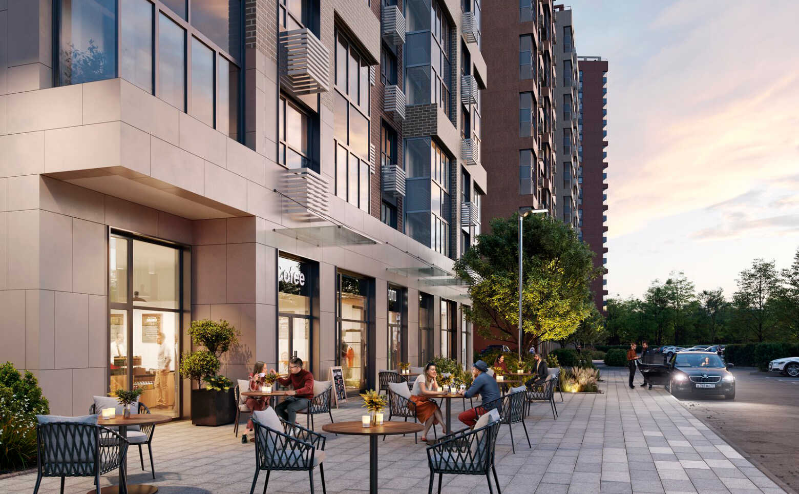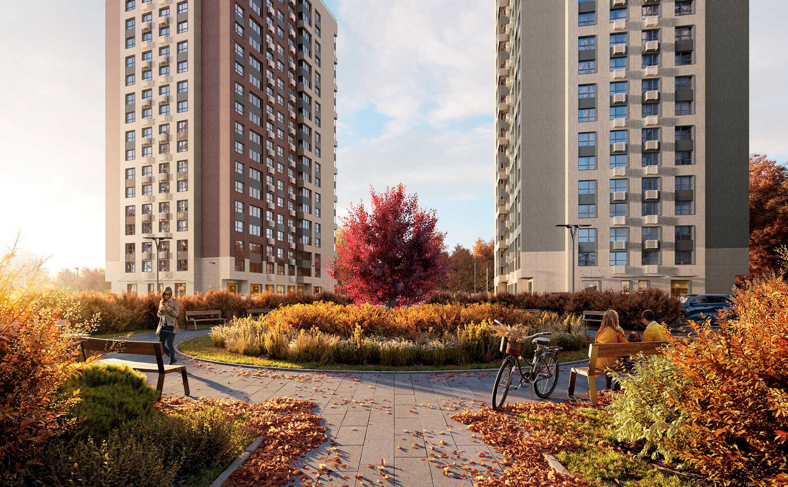 Территория комплекса охраняемая, на ней ведется видеонаблюдение. На придомовой территории расположены современные детские и спортивные площадки с безопасным покрытием. На первых этажах комплекса расположены коммерческие помещения. Во дворе выполнен ландшафтный дизайн с клумбами, дорожками и скамейками. На территории комплекса находится школа на 550 мест и детский сад на 70 мест. Для автовладельцев возведен собственный наземный паркинг.